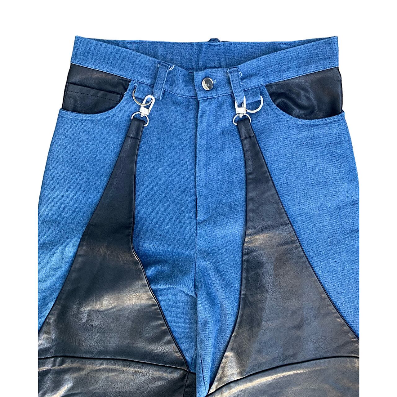 デニムとレザーのドッキングデザインとなった個性的なパンツです。